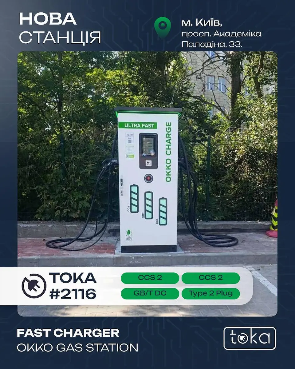 У вересні TOKA запустила нову швидкісну станцію потужністю 120 кВт на території АЗС OKKO у Пирятині Полтавської області та селі Рясне-Руське на Львівщині.