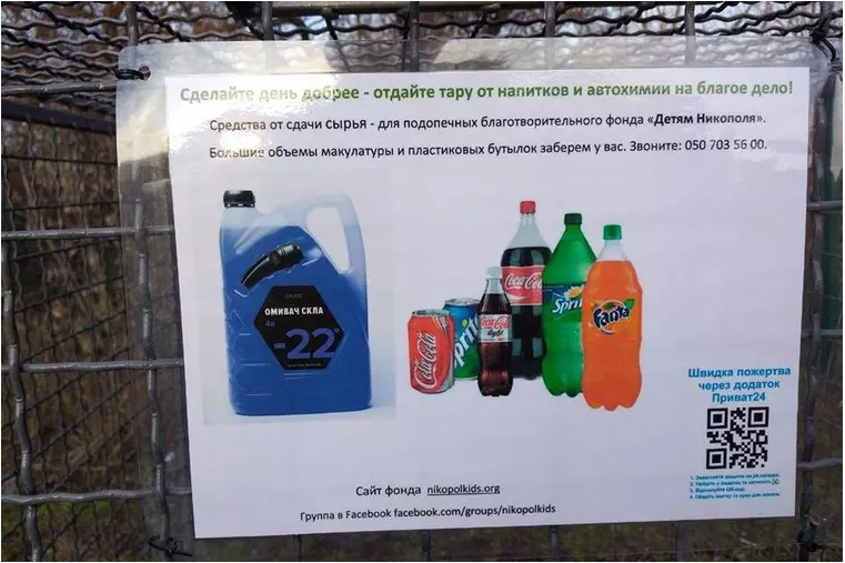 Инициатором движения по сбору вторсырья в Никополе является местная жительница Лина Фролова. Как правило, вырученные за мусор средства передаются в благотворительный фонд «Детям Никополя». Однако «владелец» вторсырья может указать, кому именно он хочет помочь.