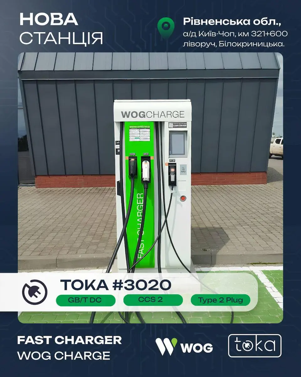 Оператор електрозарядних станцій для електрокарів ТОКА у співпраці з WOG ввела в експлуатацію нову швидкісну зарядну станцію потужністю 120 кВт на трасі Київ–Чоп (а/д Київ–Чоп, км 321+600 ліворуч, с. Білокриниця, Рівненська область). Обладнання встановлено на базі зарядного комплексу KOSTAD.