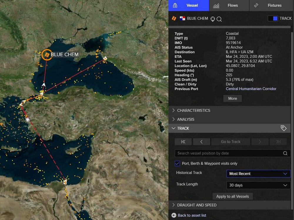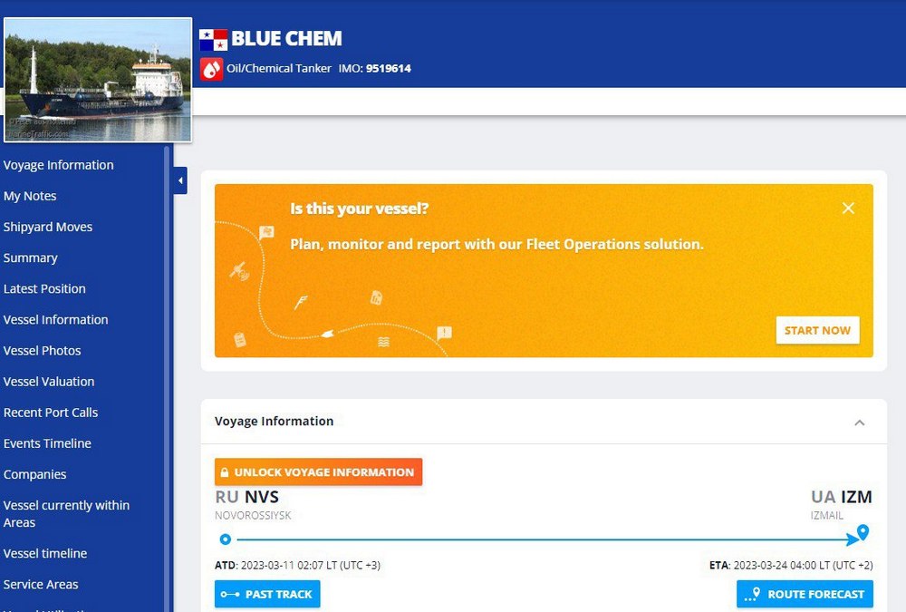 До Ізмаїлу сьогодні, 28 березня наблизився танкер Blue Chem, який 11 березня 2023 р. вийшов з російського порту Новоросійськ. За цей час за даними навігаційних систем танкер двічі проходив Босфор, відвідав Середземне
