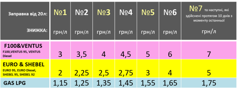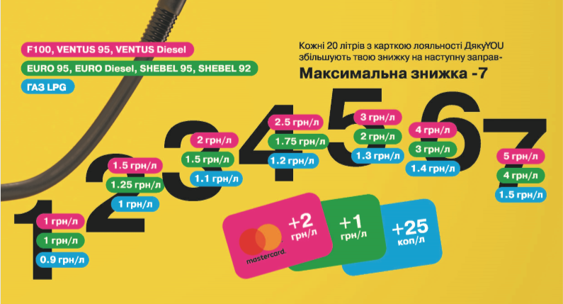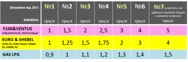 Фиксированные дополнительные скидки к любому шагу в акции: + 2 грн/л на F100/Ventus, 1 грн/л на EURO/Shebel, + 0,25 грн/л на GAS LPG