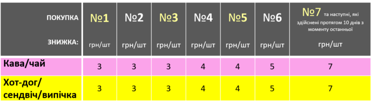 Также скидки растут пошагово на кофе/чай и хот-дог/сэндвич/выпечку до 7 грн/шт. Зафиксировать максимальную скидку на них можно покупая акционные товары каждые 10 дней.