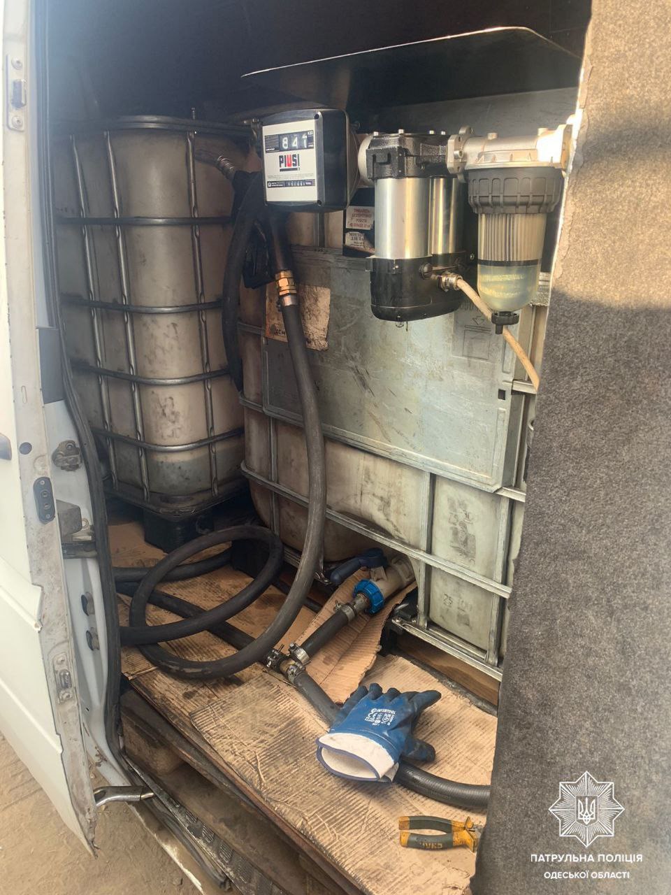 На цьому тижні на одній з дорожніх станцій патрульної поліції інспектори зупинили автомобіль Volkswagen. Оглянувши транспортний засіб, поліцейські виявили в багажному відділені резервуари з паливо-мастильними матеріалами, заправний пістолет та вимірювальний лічильник.