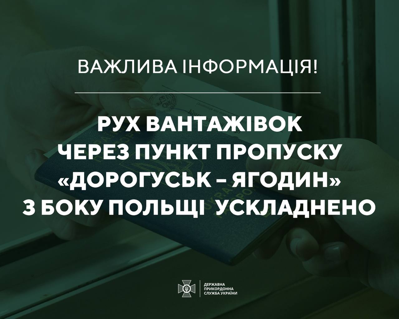 У зв’язку з акцією протесту польських перевізників перед пунктом пропуску «Дорогуськ – Ягодин» польською стороною призупинено оформлення вантажівок на в’їзд та виїзд.