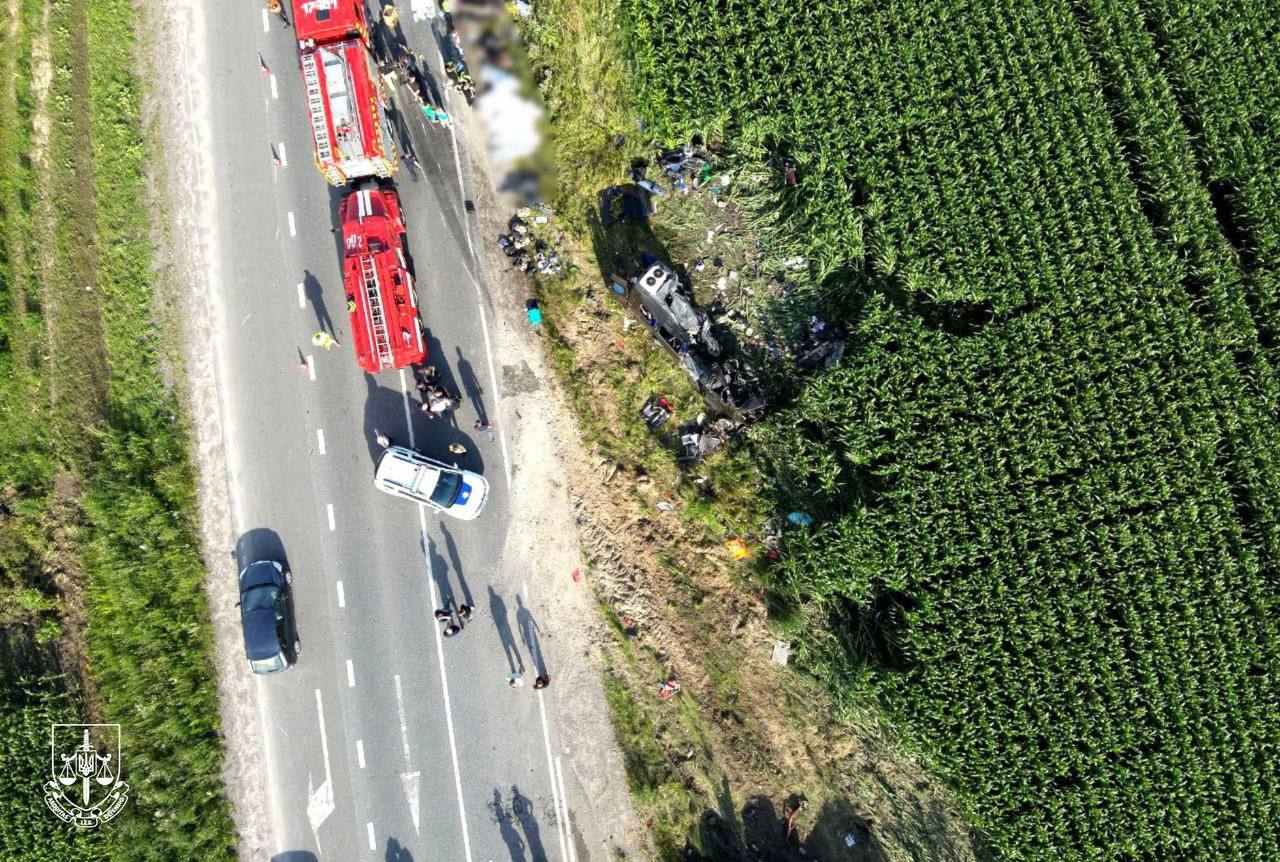 «Внаслідок ДТП загинули водії обох транспортних засобів, а також 12 пасажирів мікроавтобуса, серед яких 6-річний хлопчик. За життя ще однієї жінки, жительки міста Нетішин, Хмельницької області, борються лікарі», — розповіли в Офісі Генпрокурора.