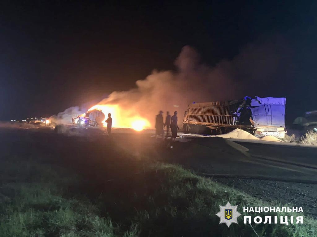«Попередньо встановлено, що водій бензовоза, рухаючись у бік Ізмаїла, допустив зіткнення із зерновозом, який стояв на узбіччі», – розповіли в поліції, додавши, що від удару загорівся причеп бензовоза.