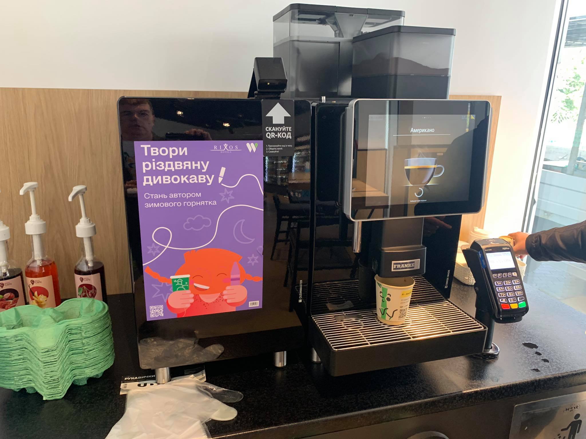 Отметим, что на АЗС установлены автоматы марки FRANKE A1000, с установленным рядом терминалом «Ощадбанка». Оплата производится после выбора напитка.