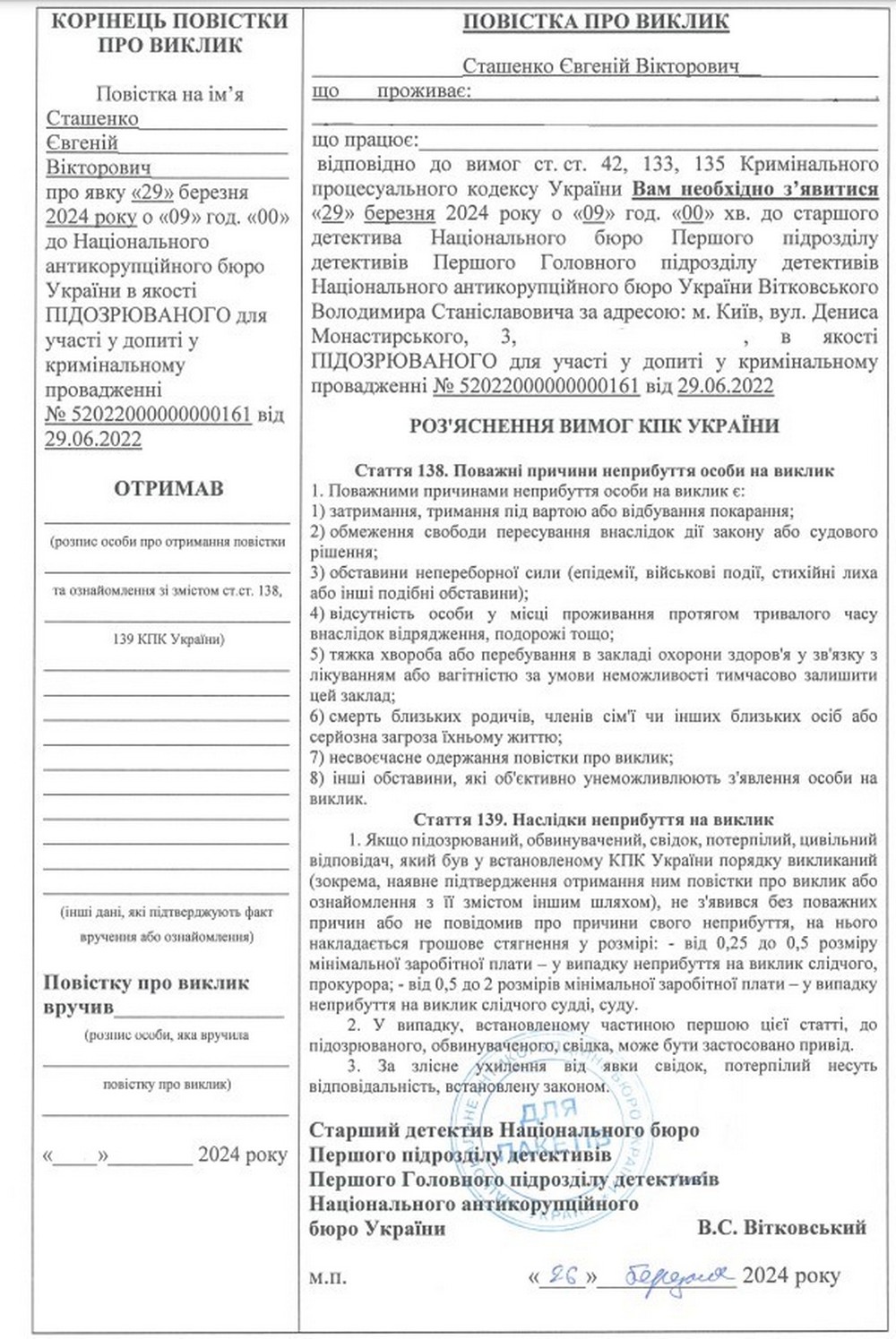 «Повістка про виклик Сташенка Євгенія Вікторовича. Вам необхідно прибути 29.03.2024 року о 09:00 до Національного антикорупційного бюро України за адресою: м. Київ, вул. Дениса Монастирського, 3 для участі у допиті в якості підозрюваного у межах досудового розслідування кримінального провадження № 52022000000000161 від 29.06.2022 року.», йдеться у повідомлені.