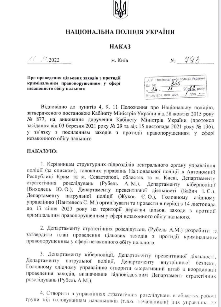 Правоохоронцям доручили в період з 14 листопада 2022 року до 13 січня 2023 року провести заходи з протидії кримінальним правопорушенням у сфері незаконного обігу пального, зазначається в документі.