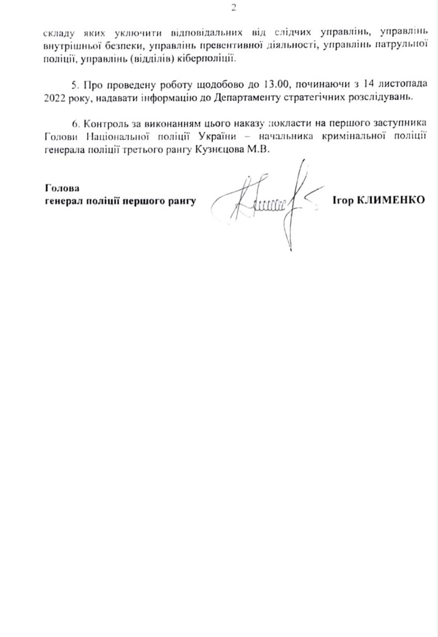 Контроль за виконанням цього наказу докласти на першого заступника Голови Нацполіції України - начальника кримінальної поліції генерала поліції третього рангу Кузнєцова М.В., - йдеться в наказі.