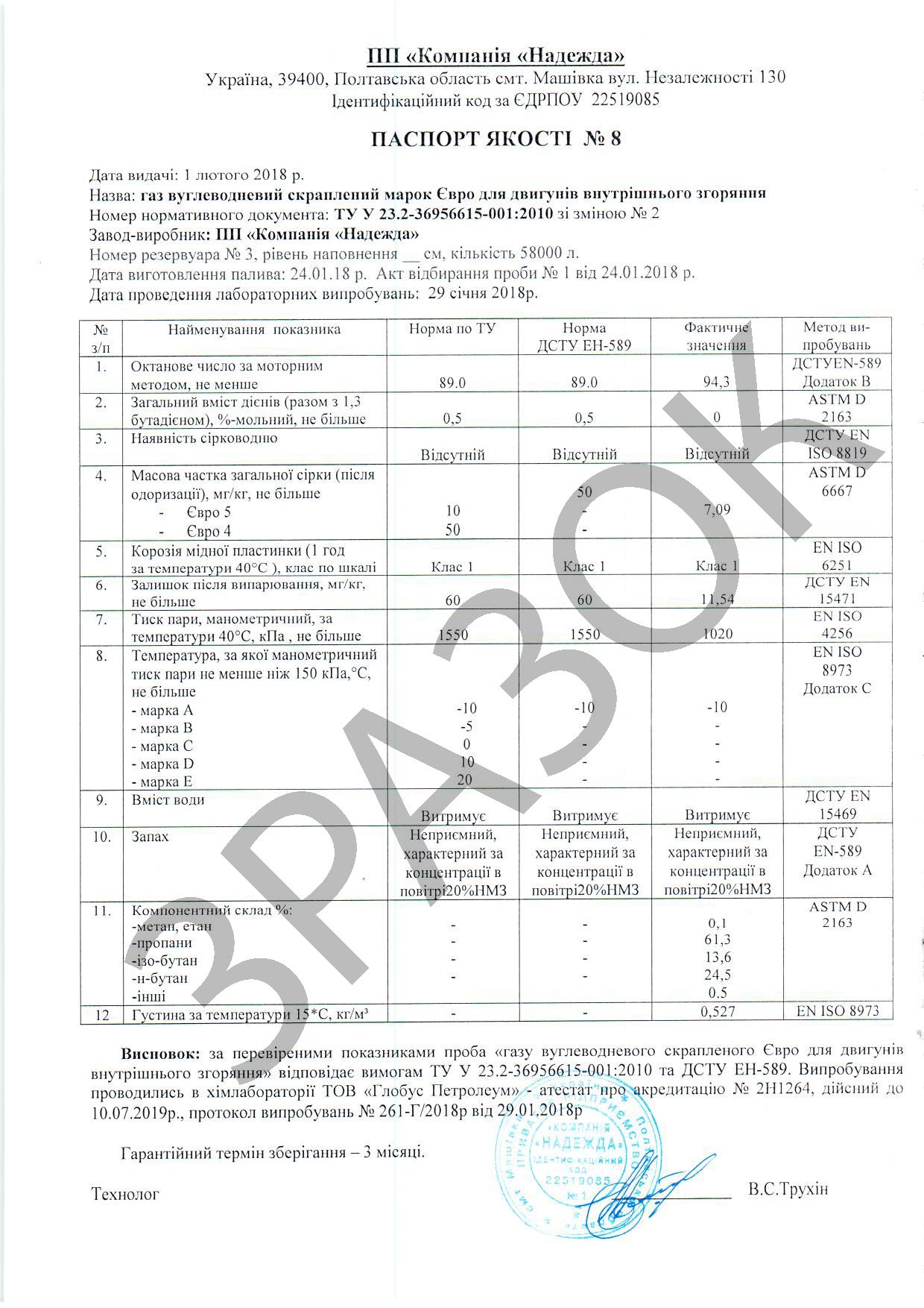 С 1 февраля 2018 года компания «Надежда» начала предоставлять собственные паспорта качества на сжиженный газ, в соответствии разработанными техническими условиями, которые отвечают европейскому стандарту EN:589.