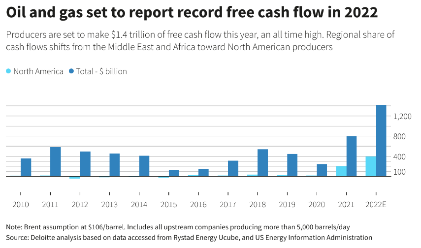 Завдяки високим цінам на енергоносії світові нафтогазові компанії за підсумками 2022 року можуть майже подвоїти сукупний обсяг вільних коштів, який сягне $1,4 трлн, повідомляє Reuters з посиланням на дослідження Deloitte. Ці гроші компанії зможуть використати для фінансування переходу на відновлювані джерела енергіх, погашення боргів або збільшення виплат дивідендів інвесторам.