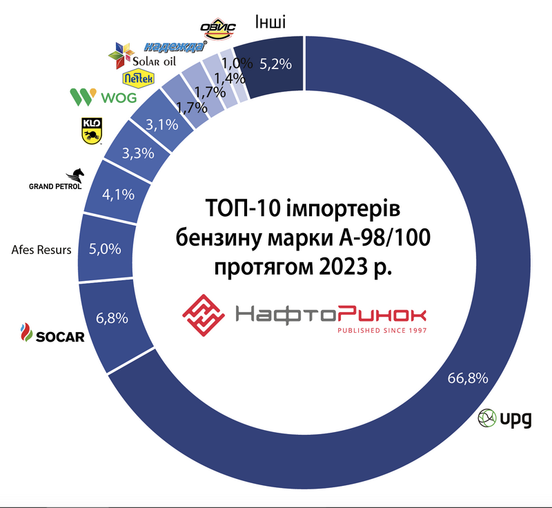 Лідерство в імпорті і, відповідно, в роздрібній реалізації високооктанового бензину за підсумками 2023 року тримає ПП «Укрпалетсистем». Мережа АЗК UPG реалізує кожні два літри бензину А-100 з трьох, які імпортуються до України. Обсяги продажу за підрахунками НафтоРинку зросли в 2,18 разів в порівнянні з 2022 р.