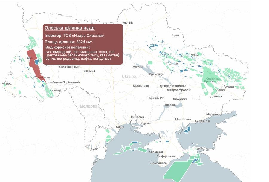 Прогнозные ресурсы Олесской площади оценивались в 2,98 трлн куб. м газа. Ежегодная добыча газа на этом участке может составлять 5-10 млрд куб. м.