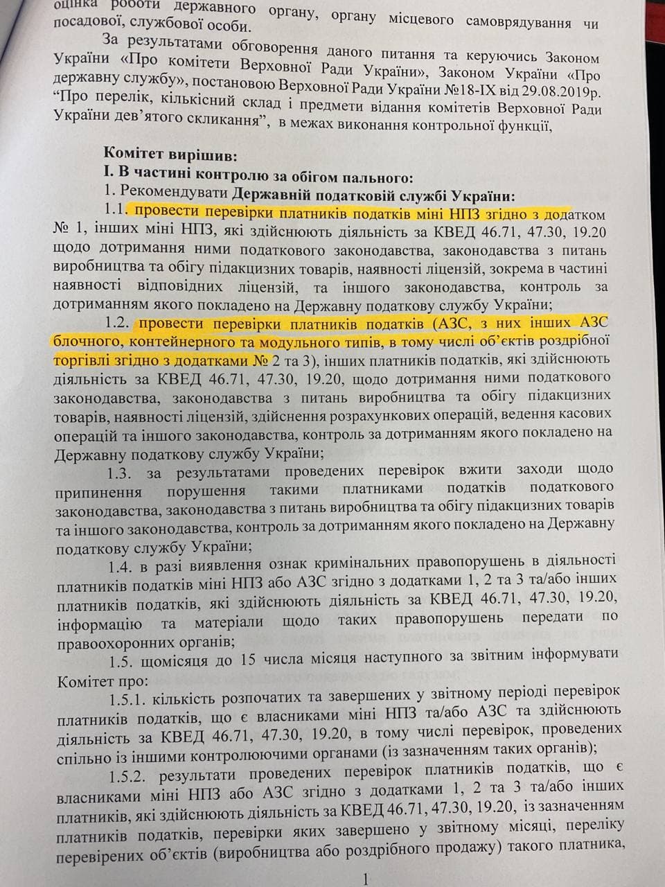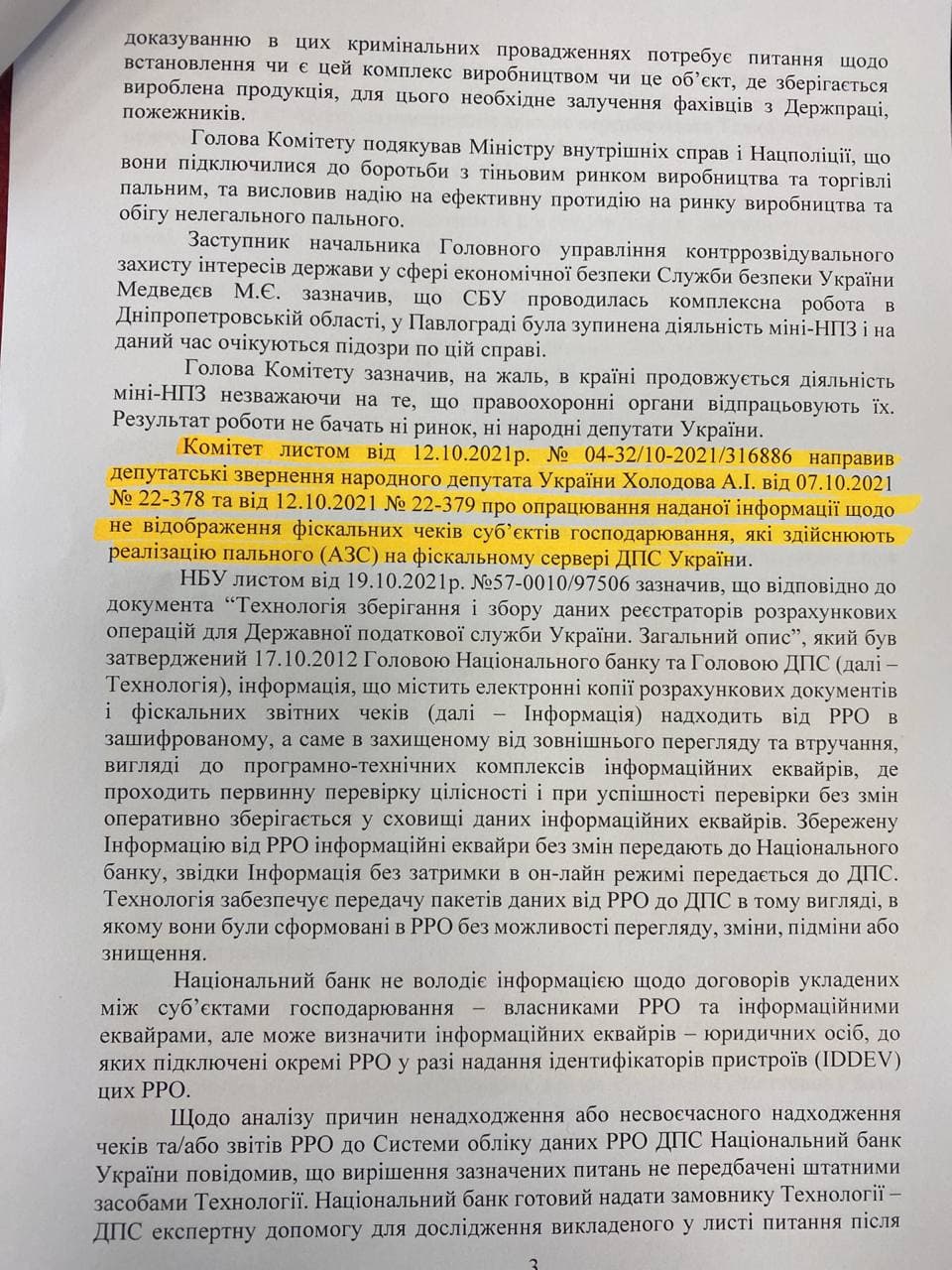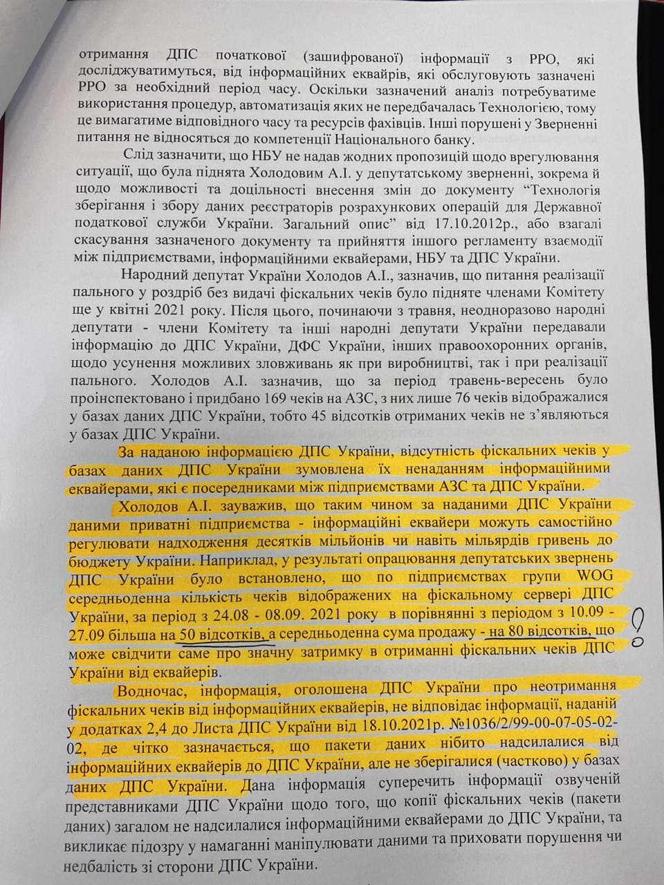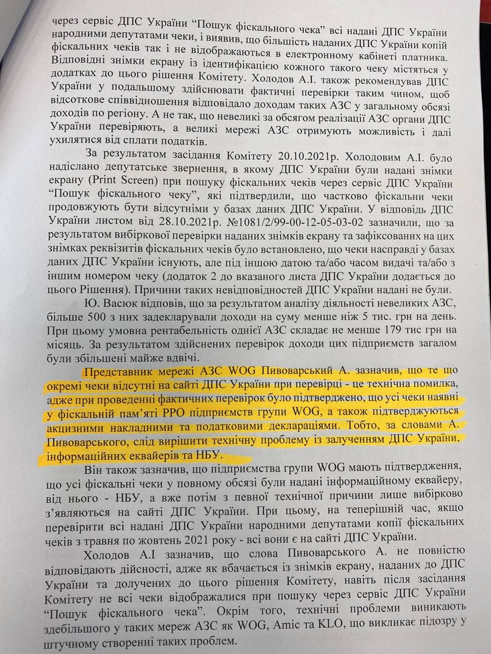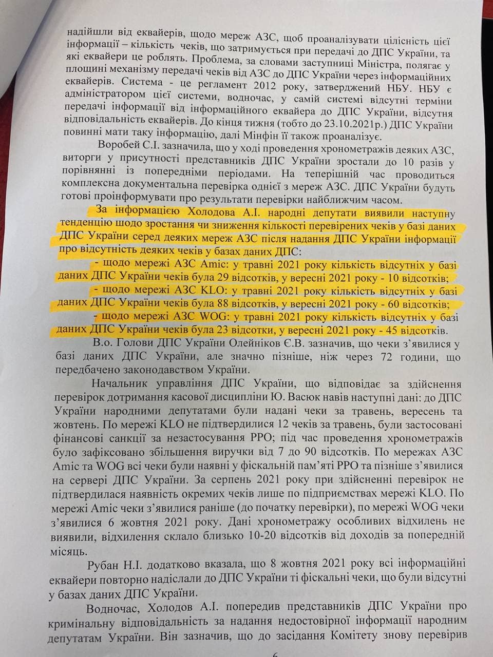 Нардеп Андрей Холодов поднял вопрос регистрации кассовых чеков на АЗС, которая выполняется в полном объеме. «Мы можем допустить, что 30-40% топливных чеков не пробивается», - сообщил он, упомянув, что задержку передачи данных на серверы налоговой могут осуществлять две эквайринговых компании: «Укркард» и «Интерплат». По данным налоговой в Украине на АЗС работает около 300 тыс. кассовых аппаратов. Кроме того Холодов поднял вопрос отпуска топлива конечному потребителю (физ. лицу) по талону, купленному за наличные деньги у предприятия, которое приобретало нефтепродукты для собственного потребления: «Через эту схему идет до 10% недоплаты в госбюджет налогов».