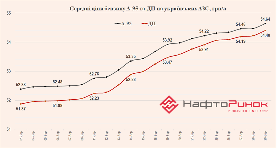Аналогічно динаміці змін вартості нафтопродуктів дрібним гуртом, зростання цін протягом вересня відбулося і на українських АЗС. Так, середня ціна дизпального станом на кінець вересня 2023 р. у порівнянні з початком місяця зросла на 2,53 грн (+4,9%) до 54,40 грн/л. Середня вартість бензину А-95 протягом аналогічного періоду збільшилась на 2,26 грн (+4,3%) до 54,64 грн/л.