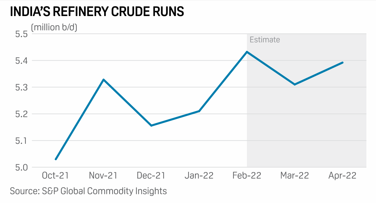 Як повідомляє S&P Global Commodity Insights, зростання споживання пального всередині країни, а також високий попит на індійські нафтопродукти, особливо дизпальне, з-за кордону спонукає індійські НПЗ працювати із завантаженням вище 100%. За словами аналітиків, зростання завантаження вимірюється двозначними цифрами, і ця тенденція збережеться в найближчі місяці. В S&P Global очікують, що середнє завантаження індійських НПЗ у 2022 році буде на 8% вище, ніж у 2021 році.