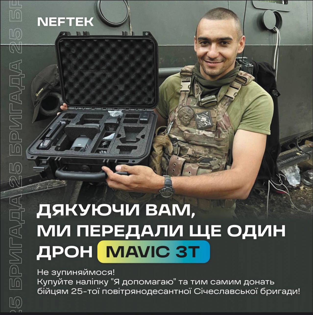 Мережа АЗС Neftek в рамках проєкту «Я допомагаю» передала військовим шостий дрон DJI Mavic3T. Про це компанія повідомила на своїй сторінці у FaceBook.