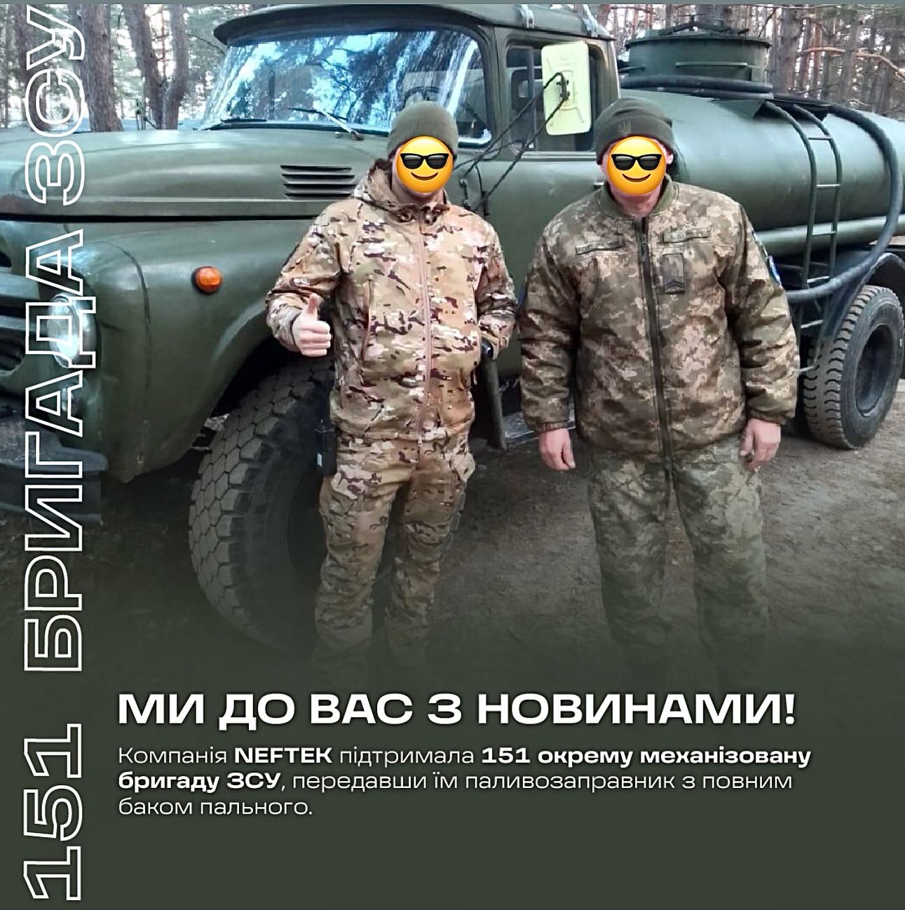 Мережа АЗС Neftek передала 151-й окремій механізованій бригаді Збройних сил України паливозаправник з повним баком пального. Про це копанія повідомила на своїй сторінці у FaceBook.