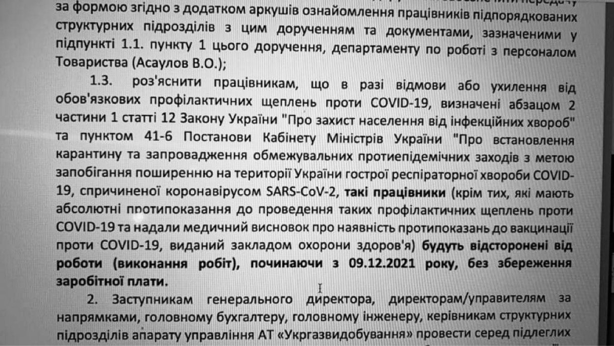 Невакцинированных сотрудников АО «Укргаздобыча» оставят без работы и зарплаты с 09.12.2021 года.