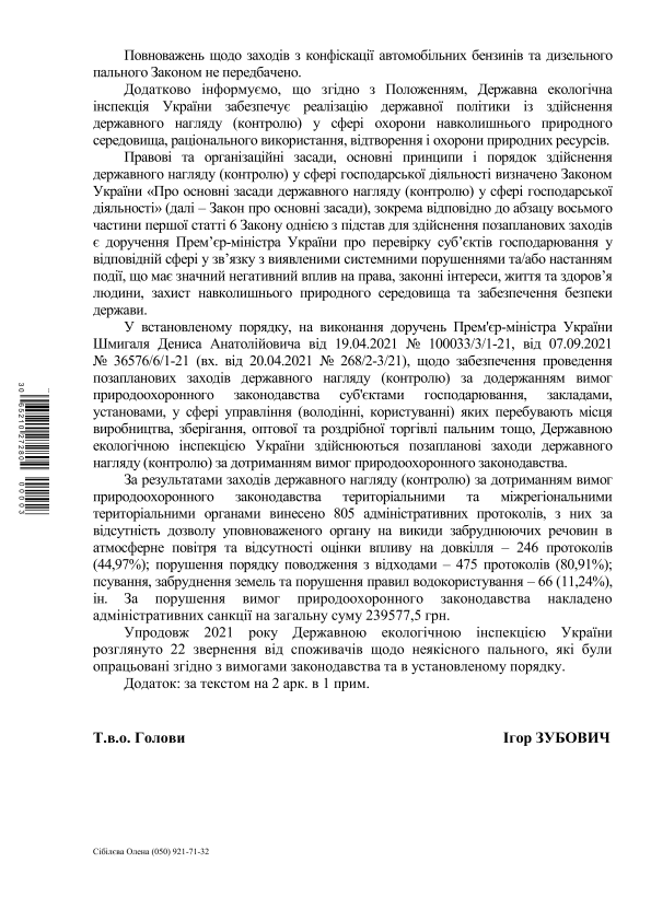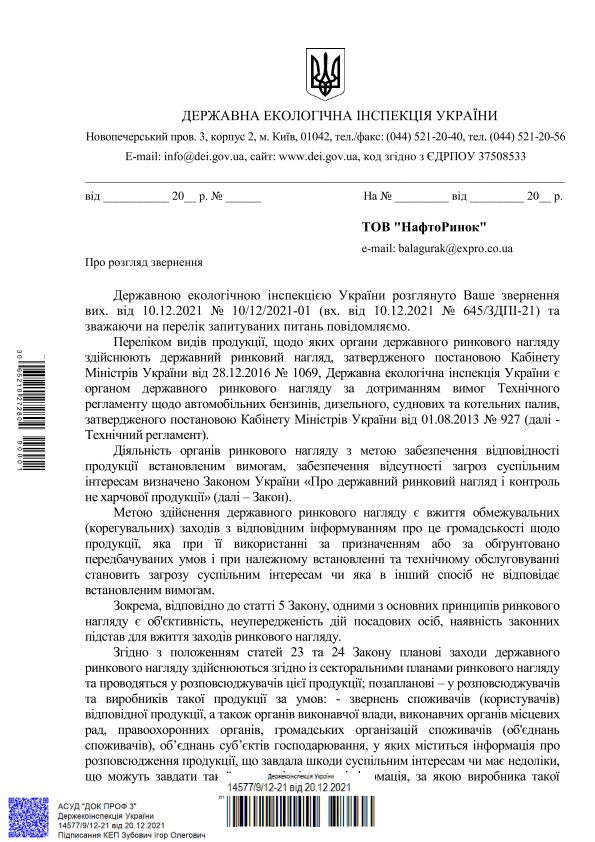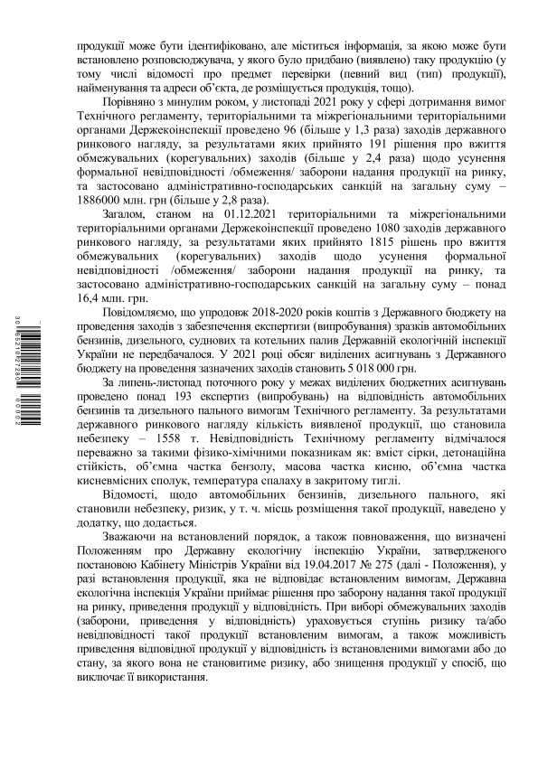 В январе-ноябре 2021 г. Государственной экологической инспекцией Украины было рассмотрено 22 обращения от потребителей относительно некачественного топлива. Об этом говорится в ответе на запрос НефтеРынка о деятельности учреждения на рынке нефтепродуктов.