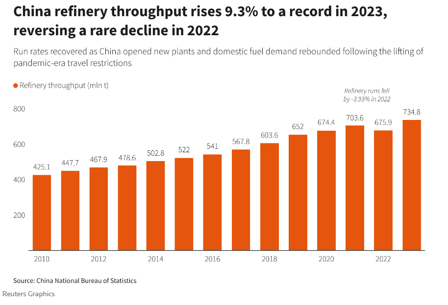 Зростанню обсягів переробки сприяло відкриття наприкінці 2022 року двох нових НПЗ: заводу PetroChina потужністю 200 тис. барелів на добу в Гуандуні та заводу Shenghong Petrochemical потужністю 320 тис. барелів на добу в Цзянсу.