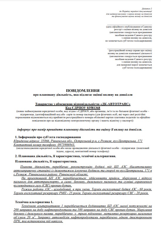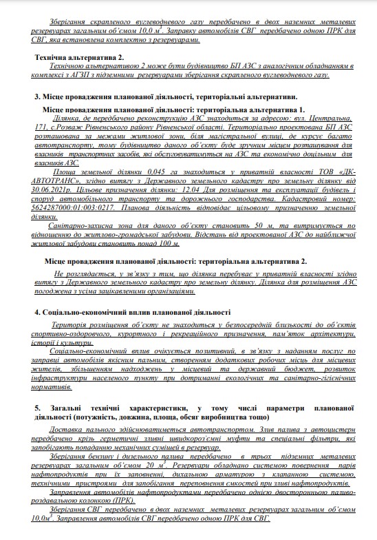 Согласно строительной документации на земельном участке площадью 0,045 га (5624287000:01:003:0217, 50.354570:26.518747), принадлежащему ООО «ДК-АВТОТРАНС», пройдет реконструкция АЗС с оборудованием тремя подземными резервуарами общим объёмом 20 м3 для бензина и ДТ, и одной двусторонней ТРК. Сжиженный газ будет отпускаться на отдельно стоящем модуле – один ТРК с двумя резервуарами общим объемом 10 м3.