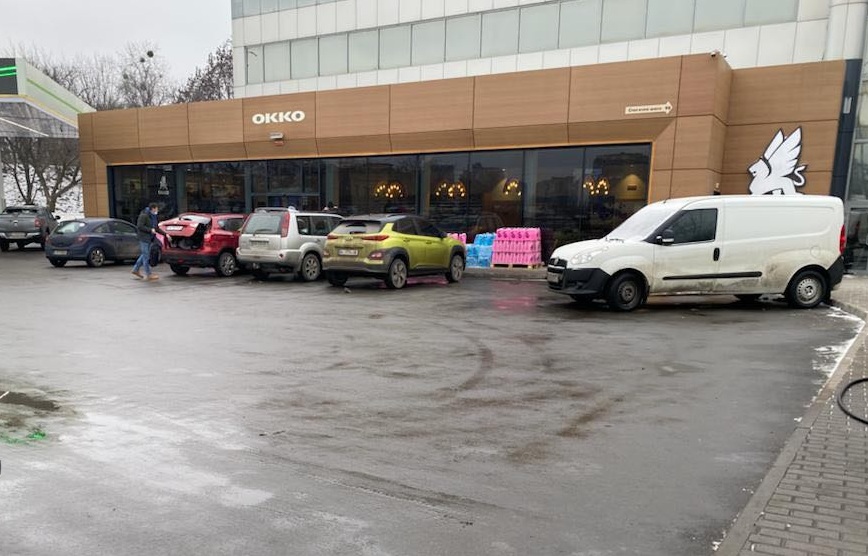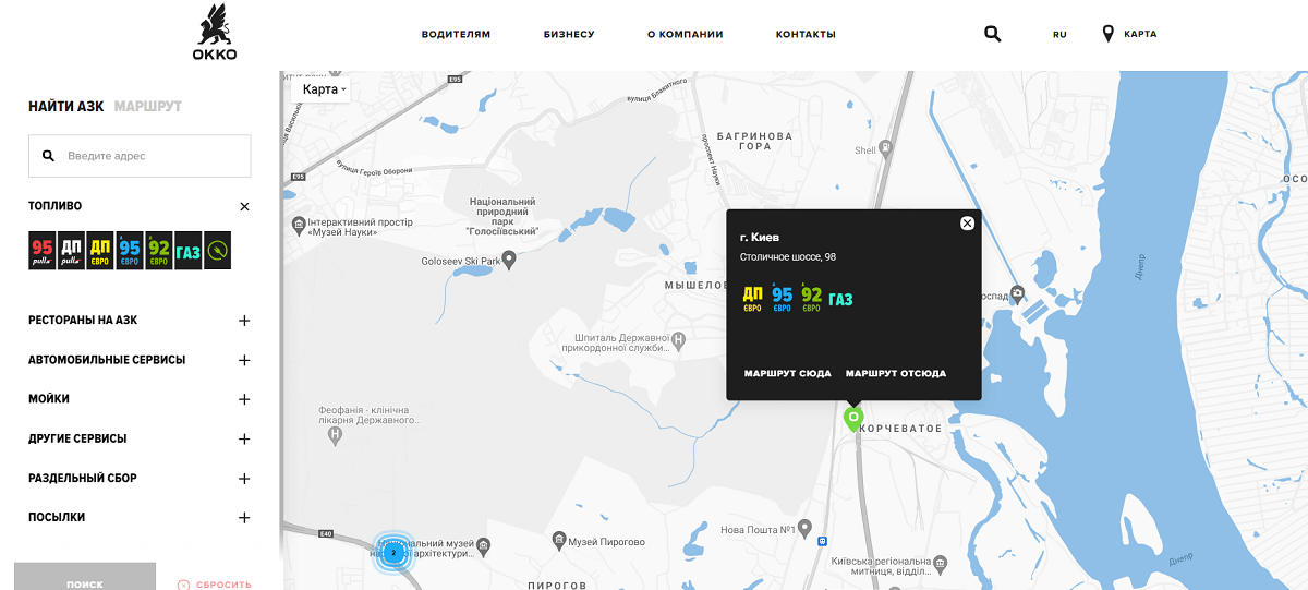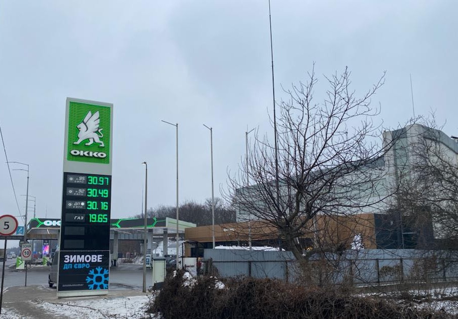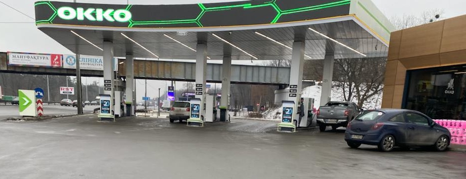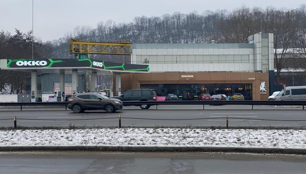 Согласно карты сети АЗС OKKO (группа компаний «Концерн Галнафтогаз», конечный бенефициар Виталий Антонов) по данному адресу размещена АЗС под брендом оператора. За 1-км перед станцией работает АЗС ANP, в 100 м далее станция SOCAR.