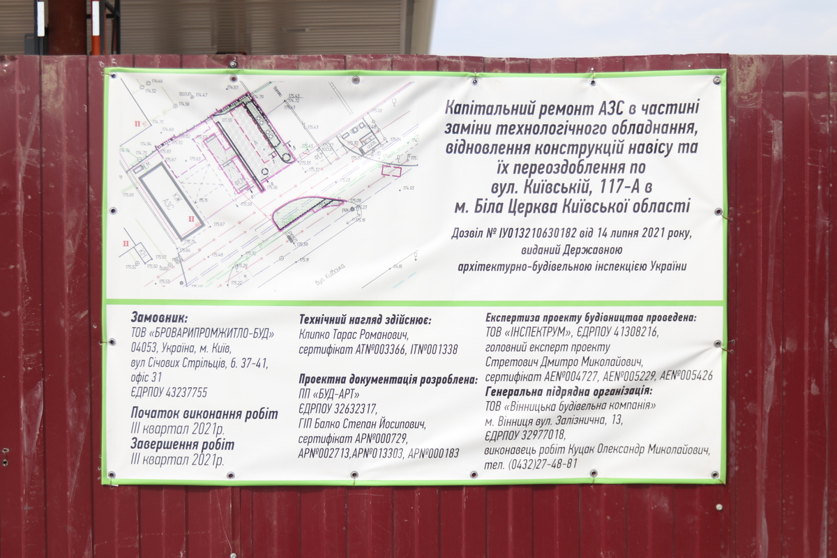 Заказчиком капитального ремонта станции на ул. Киевская, 117А является компания из пула ОККО - ООО «Броварыпромжитло-Буд» (директор Степан Пелех, учредитель - «Компания по управлению активами «Актив»), которая проводила проектно-изыскательские работы для строительства ГНС по адресу: Киевская область, город Бровары, ул. Олега Оникеенка 131-Б. Закончить работы планируется до конца сентября 2021 г.
