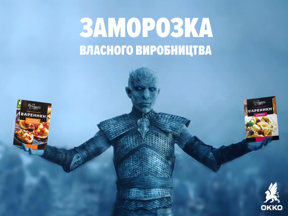 Cеть АЗК ОККО запустила промо-кампанию новых продуктов – замороженных вареников с вишней и картошкой. Особенностью является то, что компания в своей рекламе использовала тематику популярного сериала HBO «Игра престолов» (Game of Thrones).