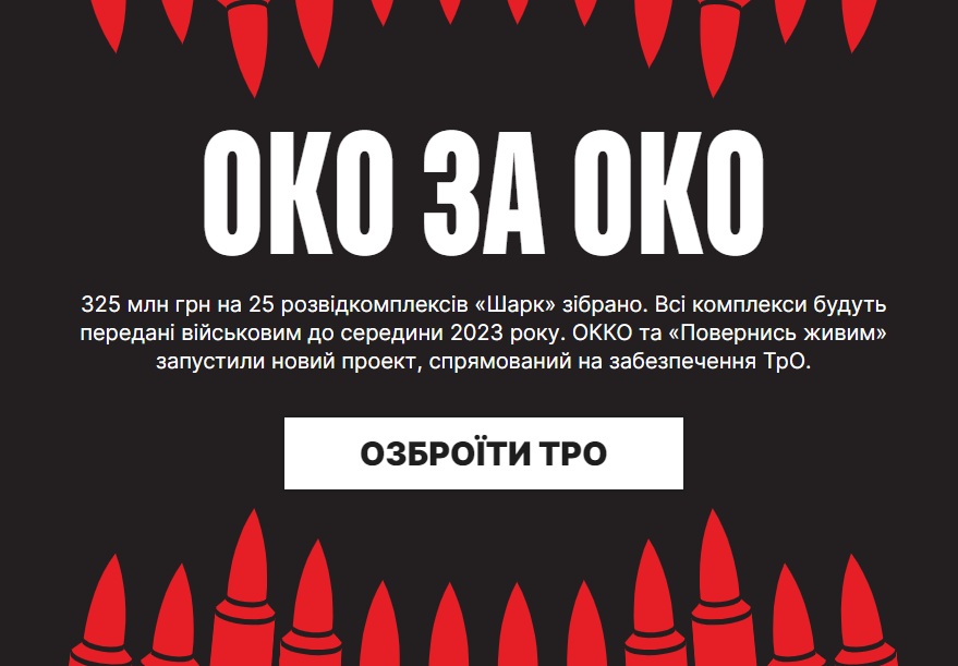 Мета проєкту “ОКО ЗА ОКО 2” – зібрати 400 млн грн на автоматичні гранатомети, крупнокаліберні кулемети і міномети для ТрО. “Механіка всім вже знайома. Конвертуємо Pulls помсти у зброю. 1 гривня з кожного літра Pulls 95 і Pulls Diesel автоматично летить на проєкт. Озброїмо нашу ТрО до зубів разом”, – йдеться в дописі компанії.