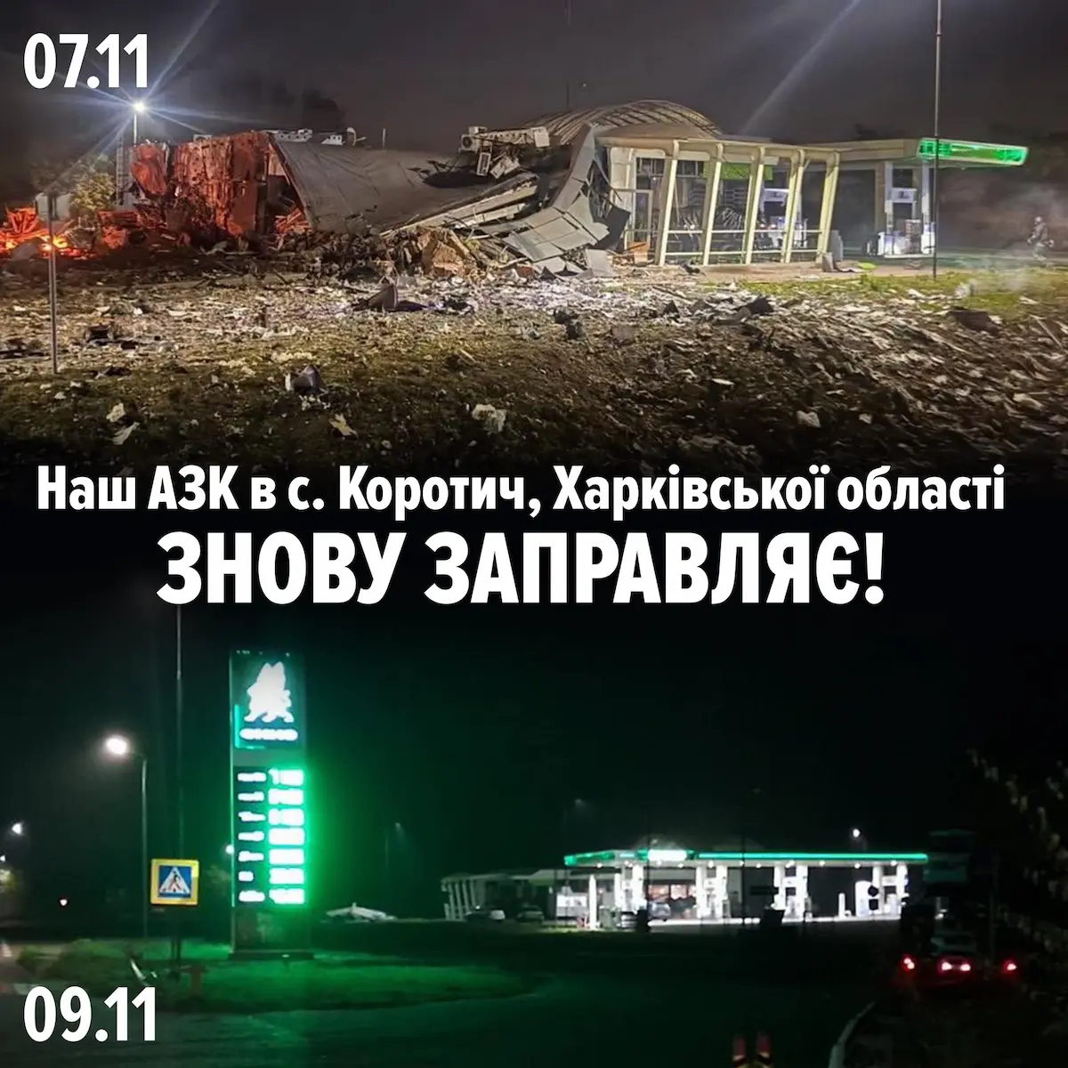 АЗК OKKO у селі Коротич Харківської області, який 7 листопада постраждав від удару російських керованих авіаційних бомб, відновив роботу.
