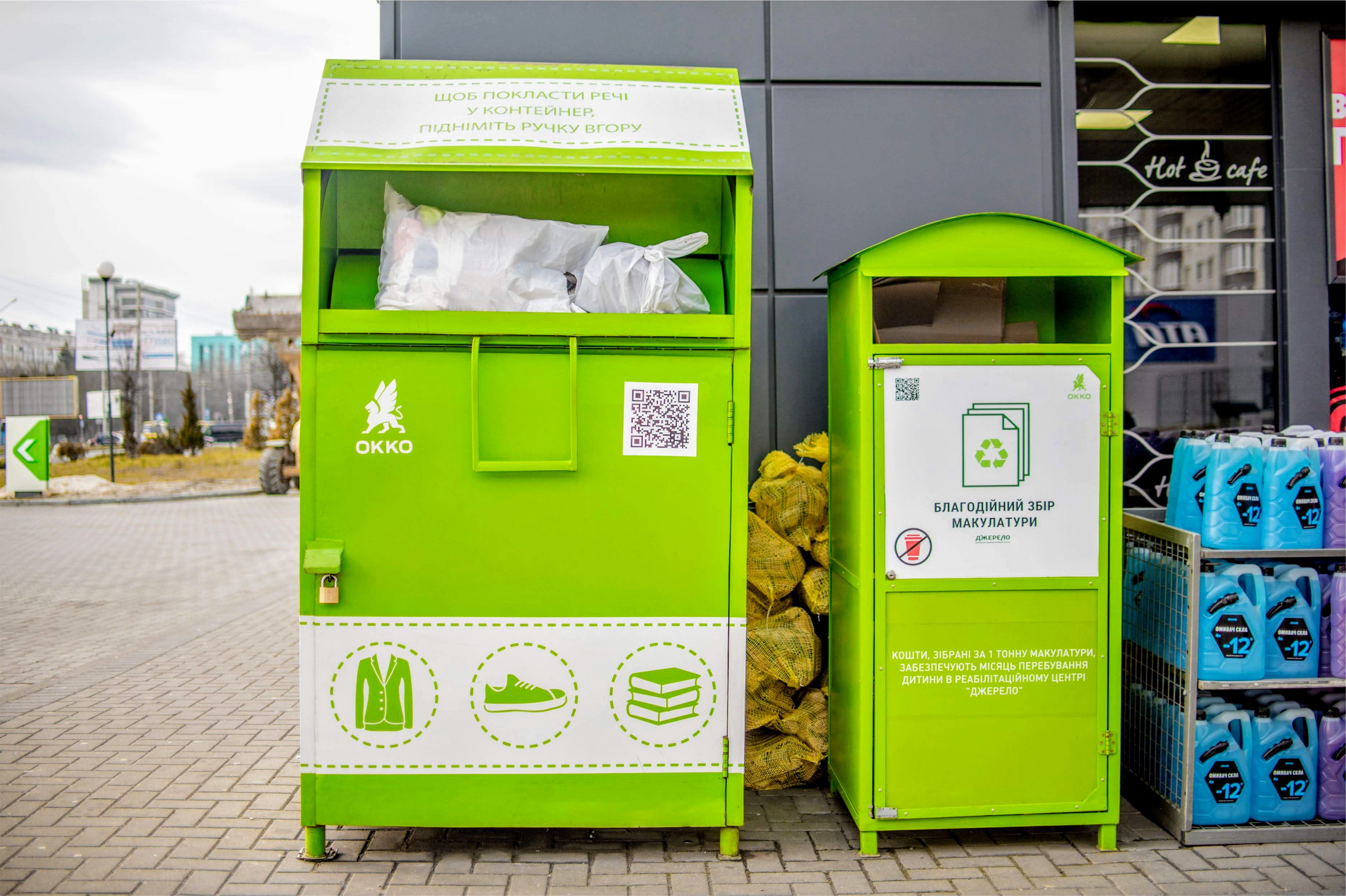 Подержанные вещи собираются на АЗК ОККО в специальные контейнеры клиентами и просто неравнодушными людьми. Одежда, постельное, обувь - все эти вещи можно сдать на 30 автозаправочных комплексах в 7 городах - Киеве, Львове, Одессе, Днепре, Харькове, Мариуполе и Запорожье. В текущем году компания планирует увеличить количество контейнеров на АЗК. Адреса уже действующих можно посмотреть здесь.