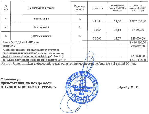 Сумма сделки составляет около 1,86 млн. грн. Ресурс перейдет покупателю в виде топливных-смарт карт. Срок заключения договора обозначен до 2 декабря 2016 года.