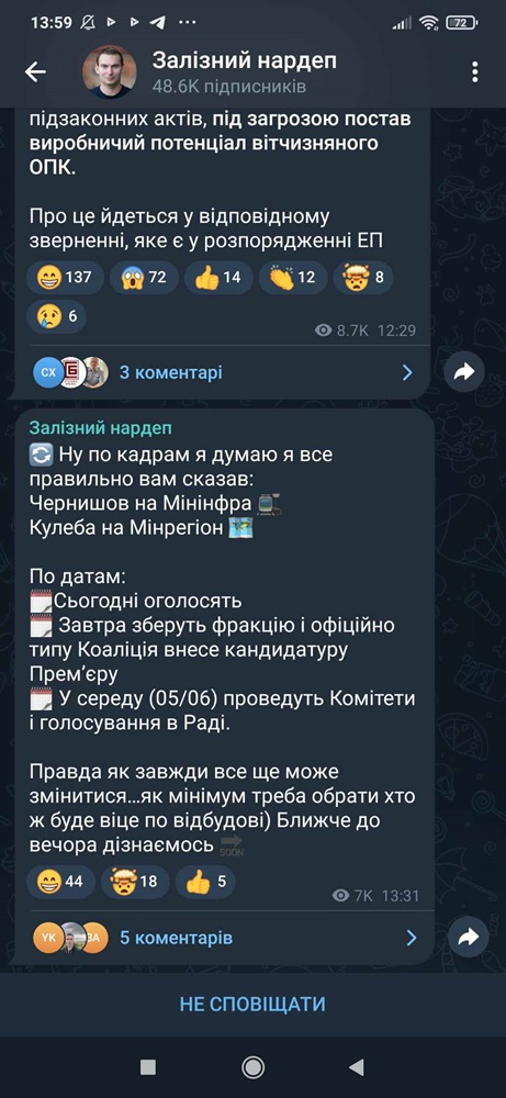 Згідно з інформацією Железняка, двох міністрів мають призначити 4-6 червня. За його словами, сьогодні імена претендентів на посади міністрів стануть офіційно відомі, завтра парламентська коаліція подасть кандидатури премʼєрміністру, а у середу може відбутися голосування в Раді.