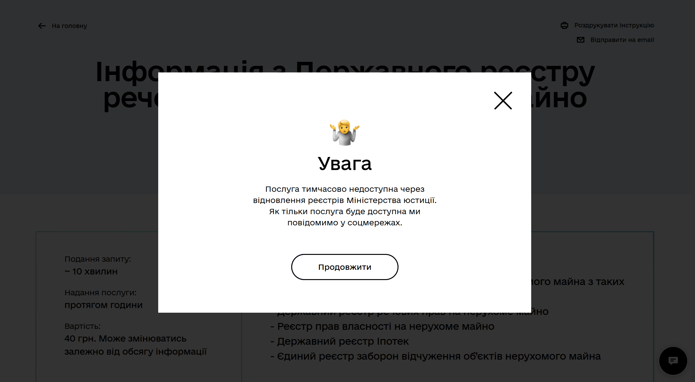 19 грудня 2024 р. було повідомлено про кібератаку на державні реєстри України. Зокрема, перестав функціонувати Державний реєстр речових прав на нерухоме майно. Відповідно до Закону України № 1952-IV, будь-які дії особи, спрямовані на набуття, зміну або припинення речових прав на нерухоме майно, об’єкт незавершеного будівництва, майбутній об’єкт нерухомості та їх обтяжень, зареєстрованих у Державному реєстрі прав, вчиняються на підставі відомостей про речові права, обтяження речових прав, що містяться в цьому реєстрі.