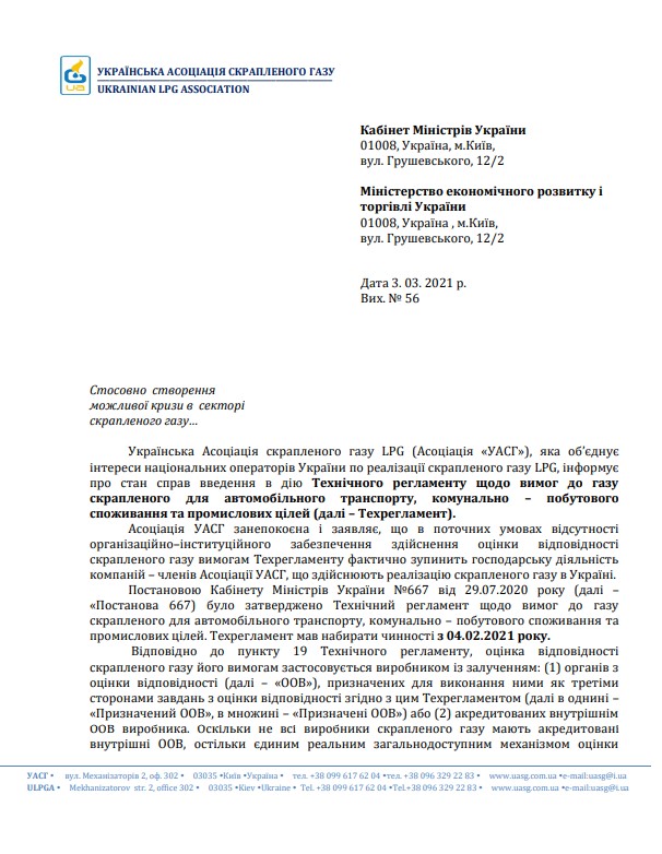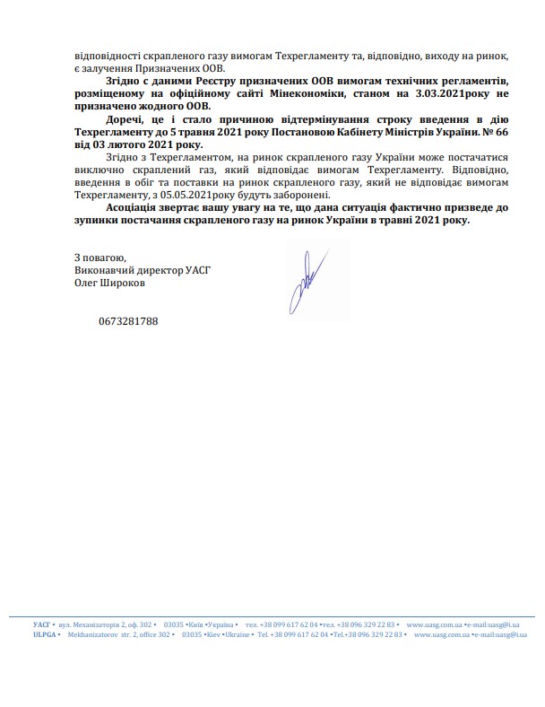 «В текущих условиях отсутствия организационно-институционального обеспечения осуществления оценки соответствия сжиженного газа требованиям техрегламентов фактически остановит хозяйственную деятельность компаний – членов Ассоциации, осуществляющих реализацию сжиженного газа в Украине» – отмечается в письме Кабинету Министров Украины от исполнительного директора УАСГ Олега Широкова.