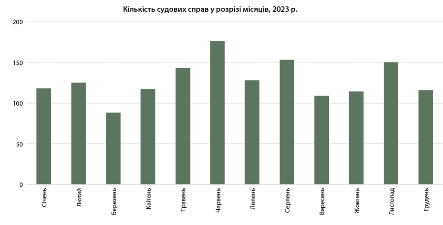 У розрізі місяців, найбільшу кількість судових рішень у 2023 р. було ухвалено у червні (176), найменшу – у березні (88).