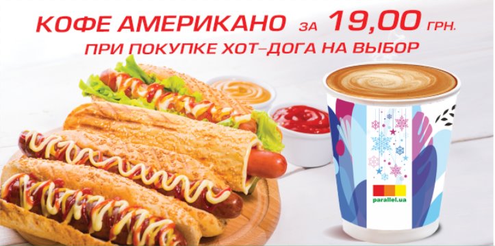 - При покупке любого хот-дога Вы сможете приобрести кофе американо по акционной цене – 19,00 грн.