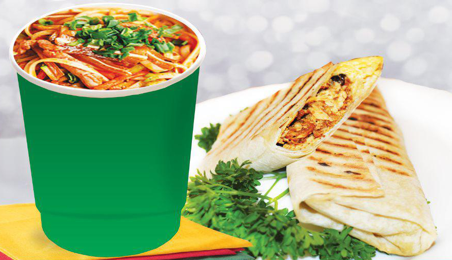 Горячая лапша представлена двумя рецептами восточной и европейской кухни: лапша с грибами и овощами, приправленная изысканным тайским соусом, и лапша с курицей и утонченным соусом «Жульен». Блюда подаются в удобных стаканах с крышкой и вилкой.