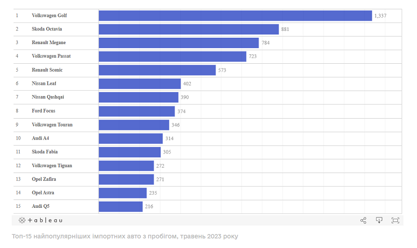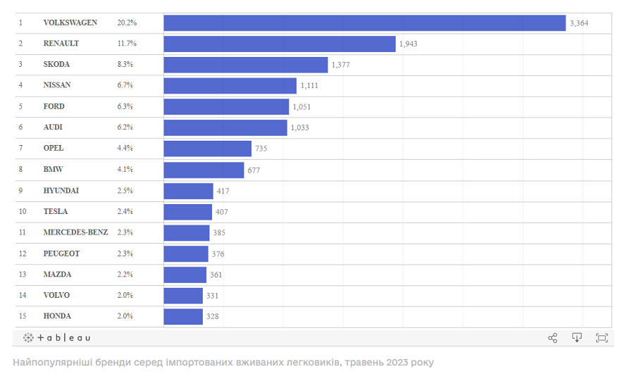 Volkswagen в цілому залишається найпопулярнішим брендом серед «свіжопригнаних» вживаних легковиків. У травні до України завезли 3,4 тис. автомобілів цієї марки, що становить 20,2% від загальної кількості імпорту.