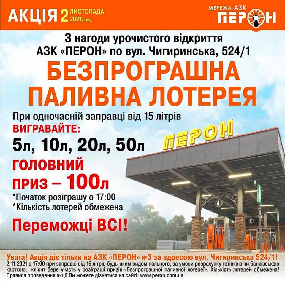 2 ноября 2021 на АЗС «ПЕРОН» №3 в Черкассах по ул. Чигиринская проходит акция «Беспроигрышная Топливная лотерея». Об этом сообщили в компании.