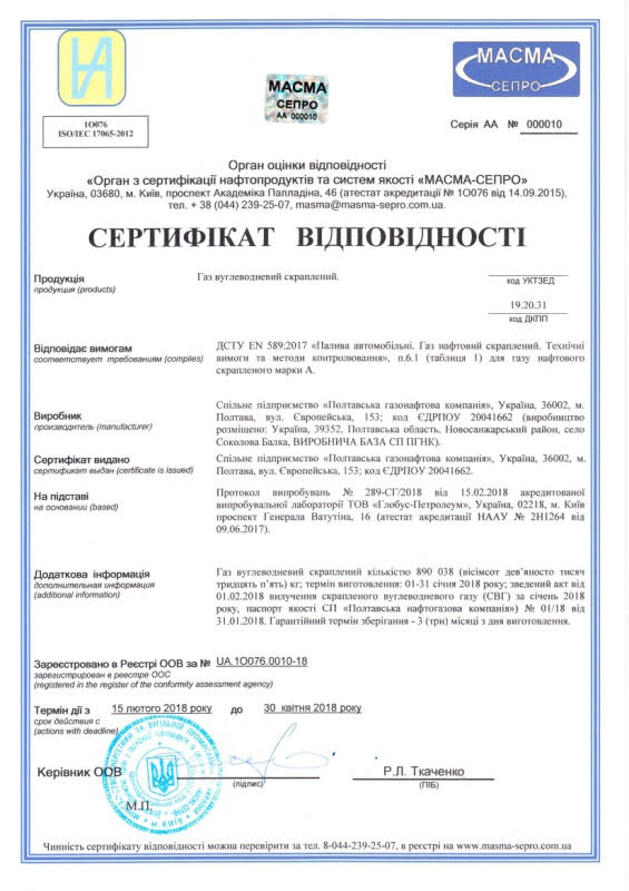 Частный производитель сжиженного газа в Украине, «Полтавская газонефтяная компания», в рамках гармонизации национальных нормативных документов с европейскими нормами, начала производство сжиженного газа стандарта ДСТУ EN 589: 2017 «Топливо автомобильные. Газ нефтяной сжиженный. Технические требования».