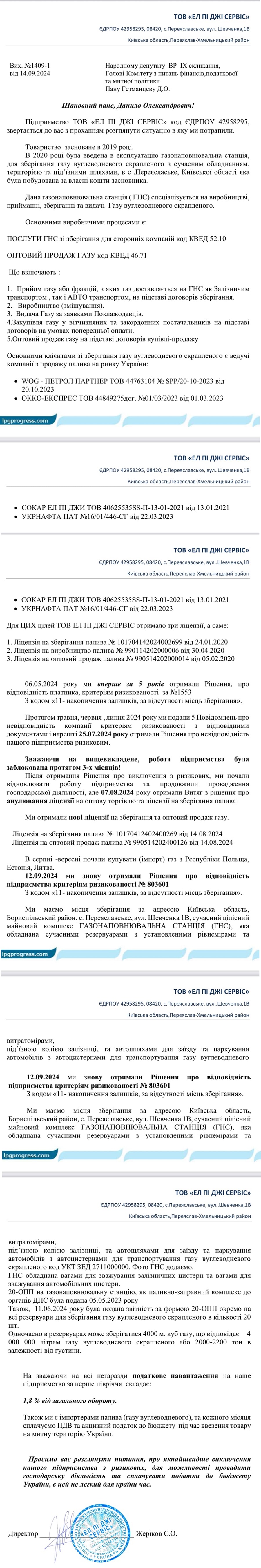 «Ел Пі Джі Сервіс» не може приймати платежі за надані послуги зберігання та перевалки пропан-бутану, що тягне відповідні наслідки для повноцінного функціонування об’єкту паливної інфраструктури. Також, зазначається, що найбільшими поклажедавцями газонаповнювальної станції є великі мережі АЗС OKKO, WOG, SOCAR, Ukrnafta та ін.