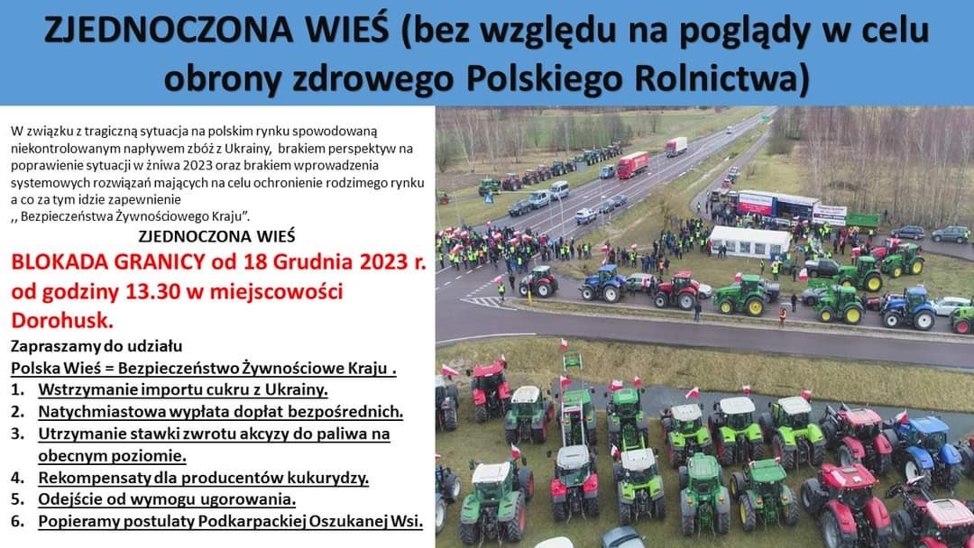 Польські аграрії сьогодні заблокують пункт пропуску «Дорогуськ-Ягодин» на польсько-українському кордоні. Про це повідомив член націоналістичної партії Конфедерація свободи і незалежності (Konfederacja Wolność i Niepodległość) Рафал Меклер на своїй сторінці у соцмережі X.
