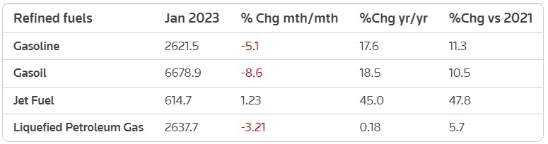 Реалізація бензину в січні впала у порівнянні з груднем на 5,1%, до 2,6 млн т, а продажі LPG - на 3,2%, до 2,6 млн т.