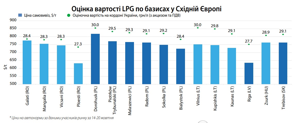 Надходження з Литви зменшилися до 0,7 тис. т, в порівнянні з 2,2 тис. т за 7-13 жовтня. За словами імпортерів, на Мажейкяйському НПЗ до кінця місяця триватимуть планові ремонтні роботи, що впливатиме на обсяги пропозицій. Відповідно, протягом останнього тижня газ з Мажейкяю взагалі не надходив. Ресурс постачається з ГНС в Вільнюсі, Купішкісі та Каунасі. При цьому середня ціна надходжень за угодами придбання на умовах FCA ГНС Литви зросла на $64/т, до $747/т.