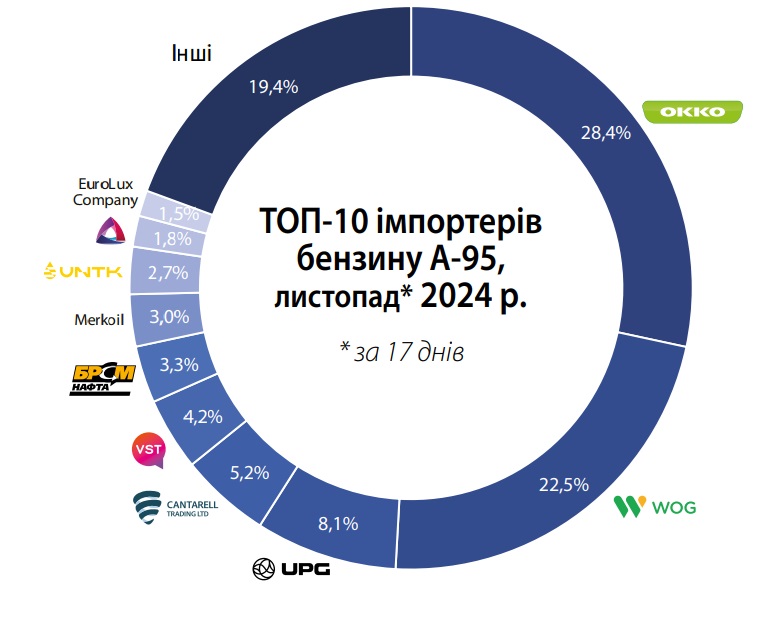 Найбільше бензину у листопаді ввезли OKKO (28,4% імпорту), WOG (22,5%) та UPG (8,1%). до п’ятірки гайбільших імпортерів також увійшли Cantarell (5,2%) та VST (4,2%). «БРСМ» опинилася на 6 місці з часткою 3,3%.