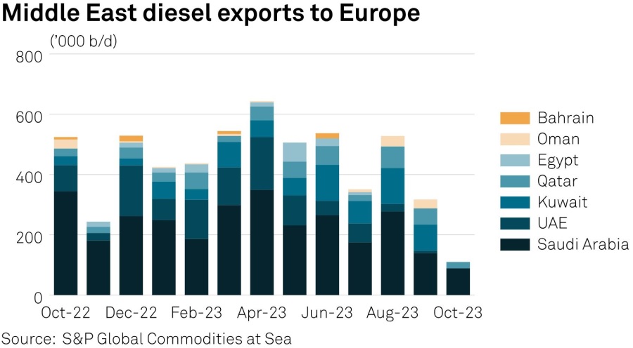 Згідно з даними S&P Global Commodities at Sea, експорт дизельного пального з Близького Сходу до Європи у жовтні становили 110 тис. барелів на добу, різко скоротившись у порівнянні з попереднім місяцем, коли обсяги поставок становили 317 тис. барелів на добу.