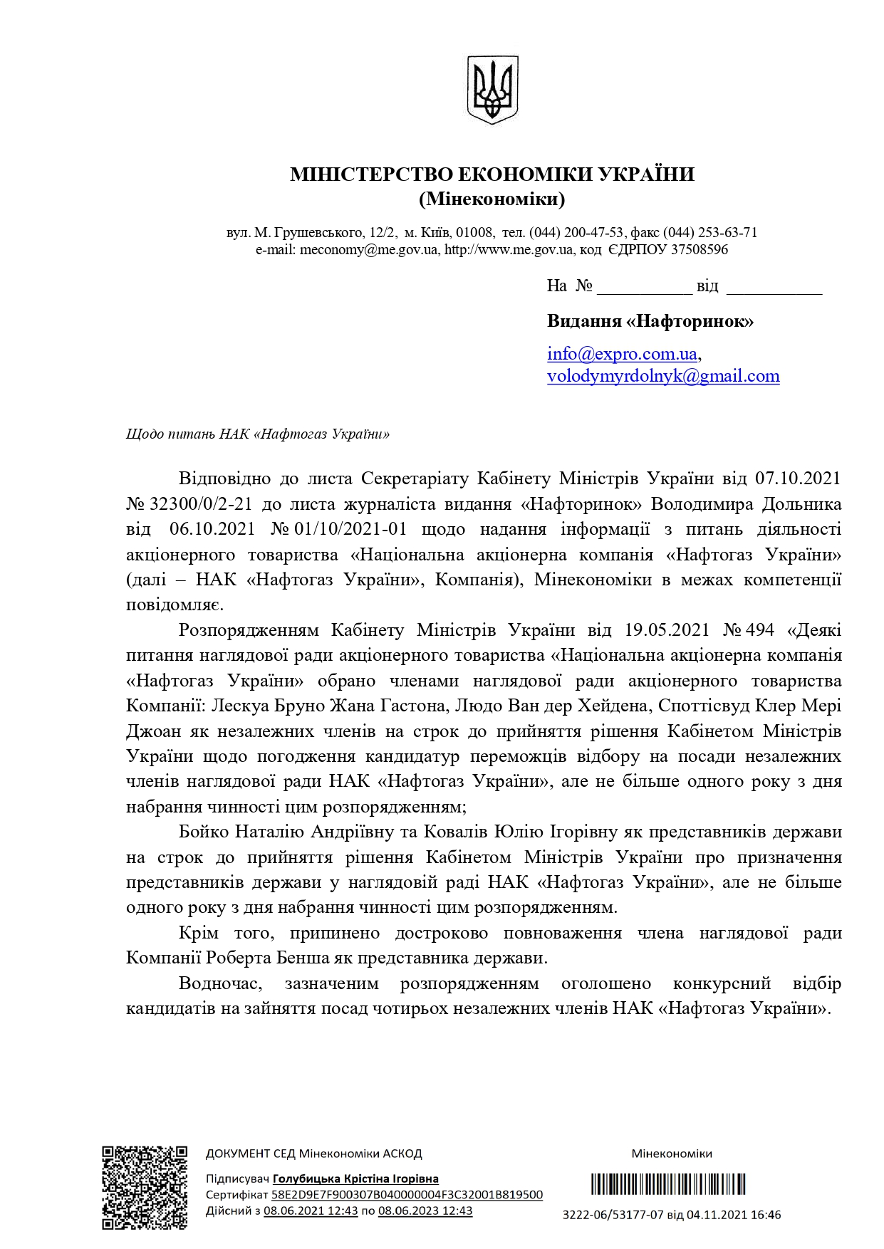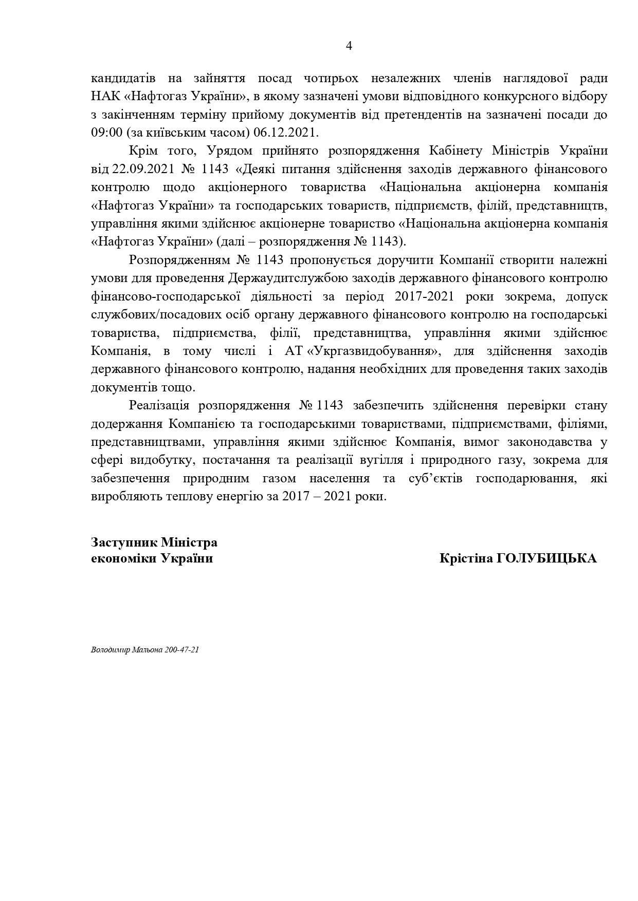 Распоряжением No 1143 предлагается поручить компании создать надлежащие условия для проведения Госаудитслужбой мер государственного финансового контроля финансово-хозяйственной деятельности за период 2017-2021 года в частности, допуск должностных/должностных лиц органа государственного финансового контроля на хозяйственные общества, предприятия, филиалы, представительства, управление которыми осуществляет Компания, в том числе и АО «Укргаздобыча», для осуществления мероприятий государственного финансового контроля, предоставление необходимых для проведения таких мероприятий документов и т.д.